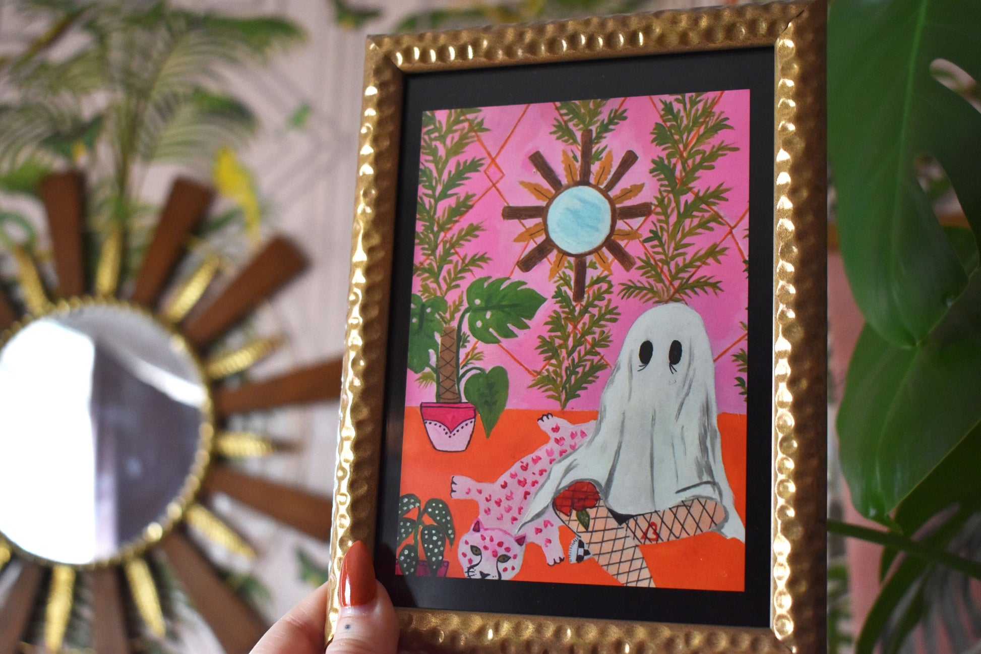 “I'm Always Here” is a print of an original piece of artwork created by ihadotherplans. Designed using mixed media - ink and acrylic paint, the image depicts a tattooed sheet ghost sitting in a tropical pink and orange room, surrounded by plants.