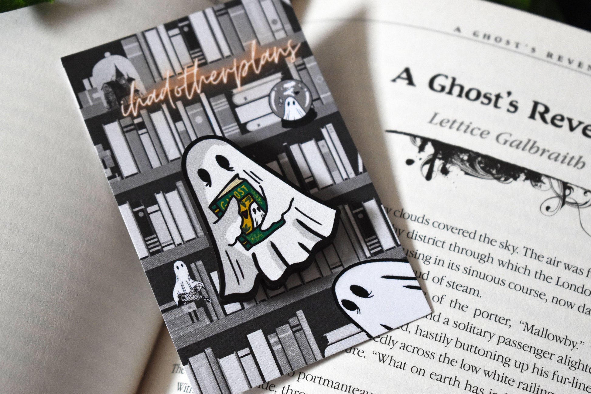 Showcase your love for all things spooky with the ihadotherplans ghost & book pin! Part of the Haunted Library collection.