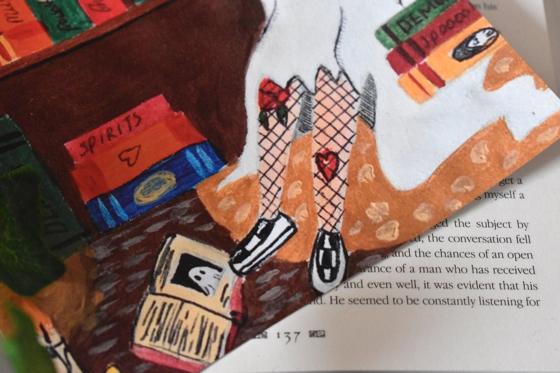 “The Haunted Library” is a print of an original piece of artwork created by ihadotherplans. Designed using acrylic and ink, it depicts a sheet ghost sat on the floor of a library, getting lost in the lovely world of words. A bookshelf towers behind her, with a friendly spook peeking through the terrifying tomes & dusty novels.