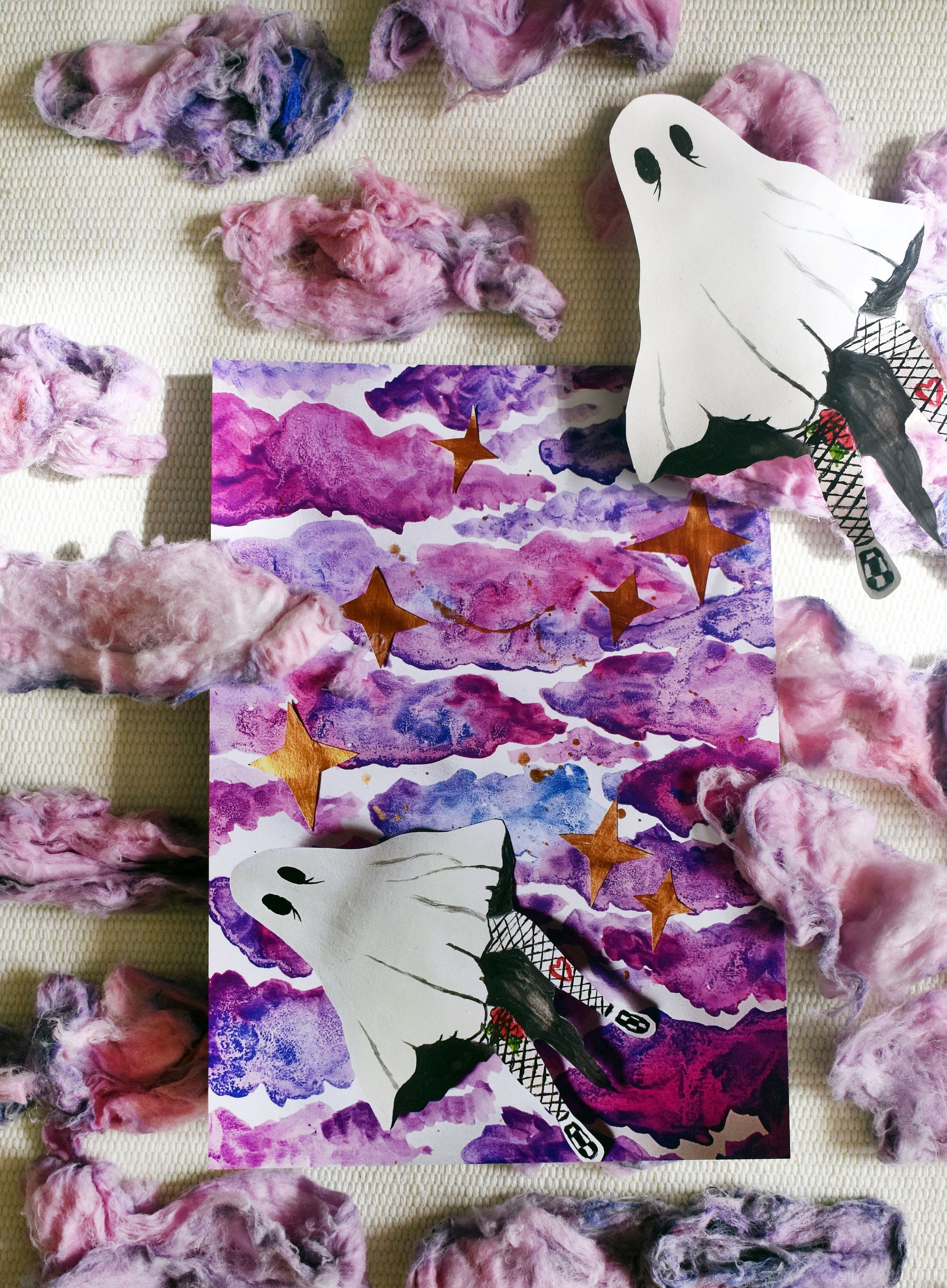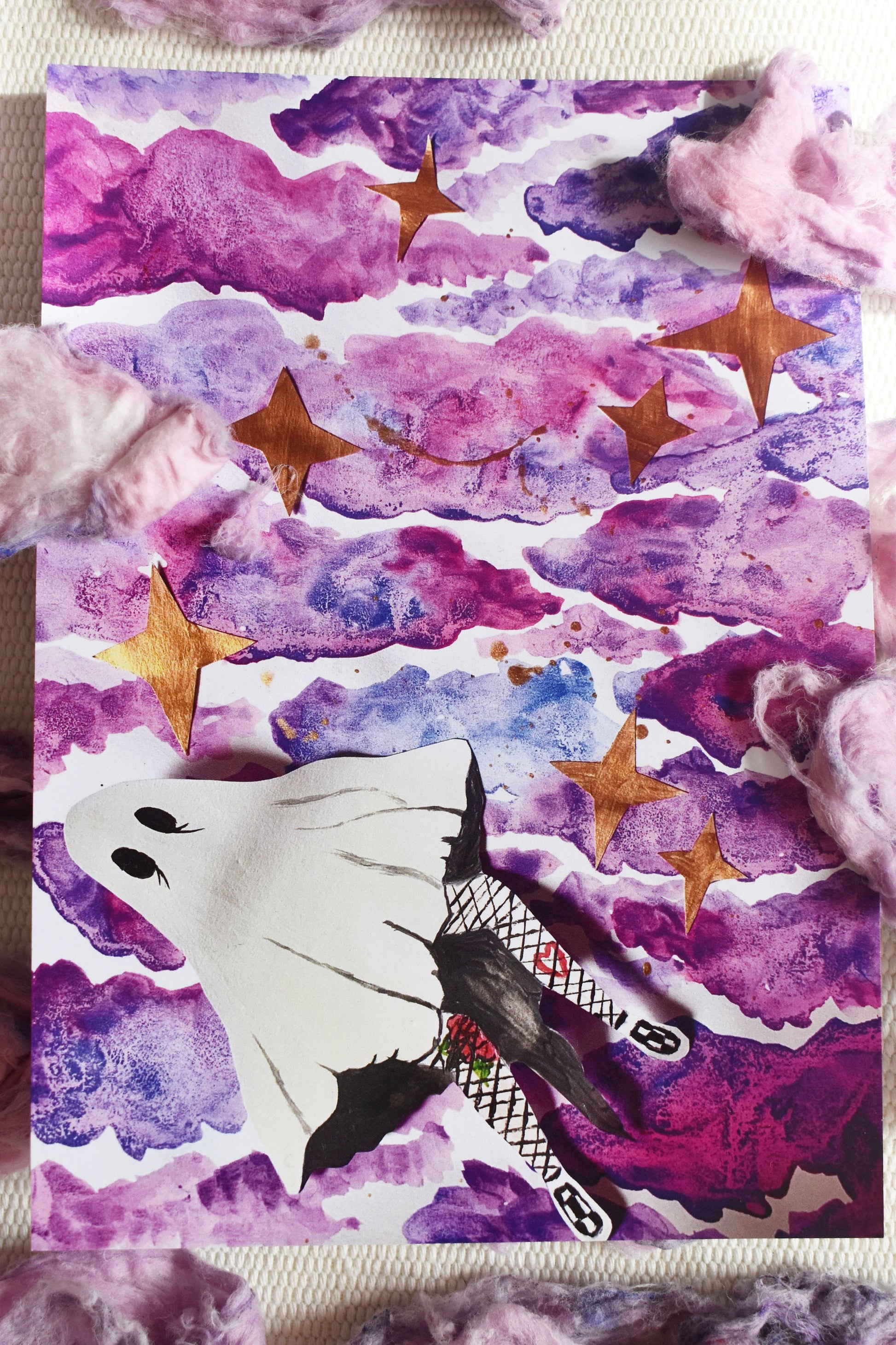 “Forever Falling” is a print of an original piece of artwork created by ihadotherplans. Designed using mixed media and collage elements, the image depicts a tattooed sheet ghost, falling through beautiful pink and purple clouds.