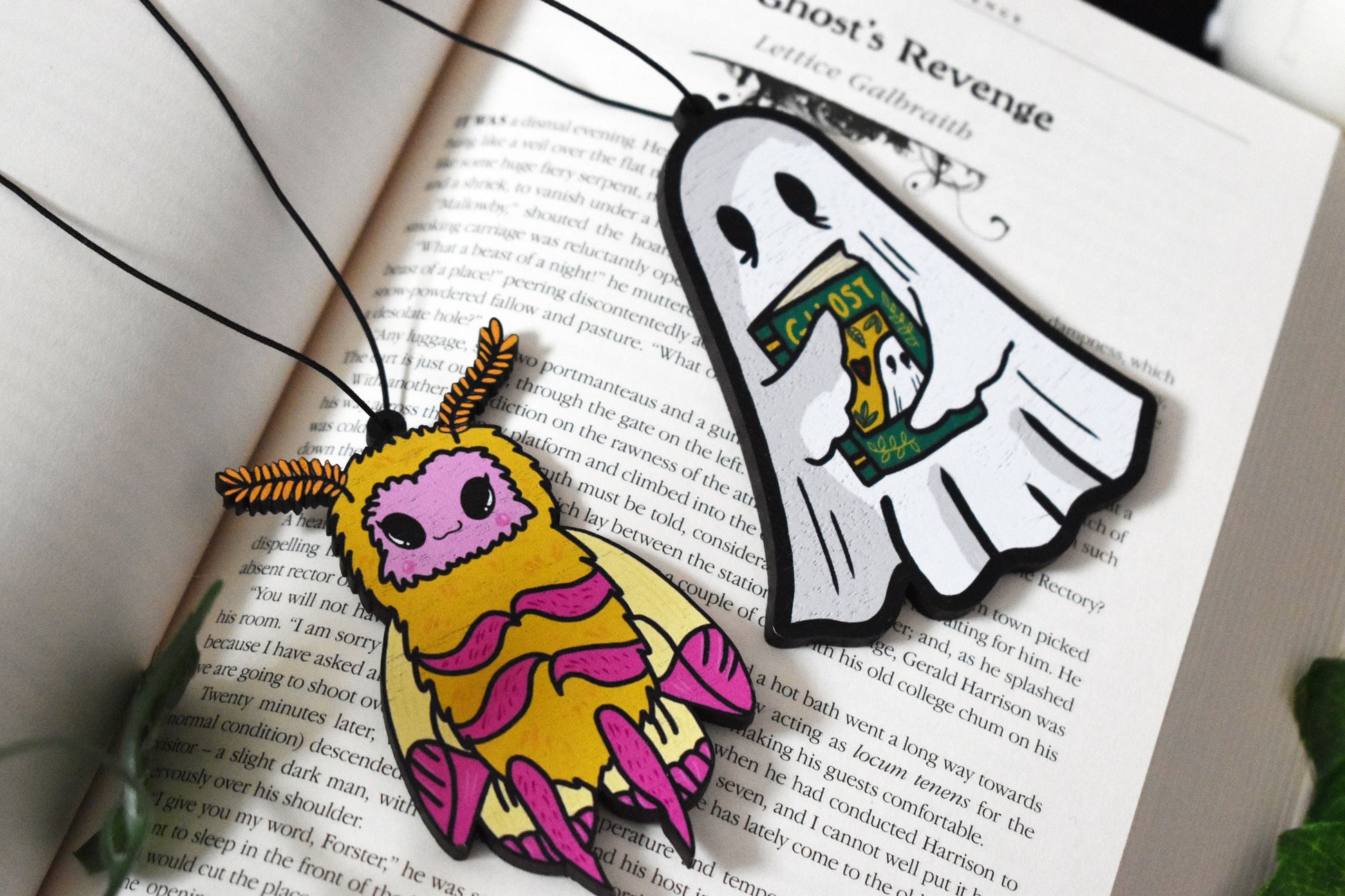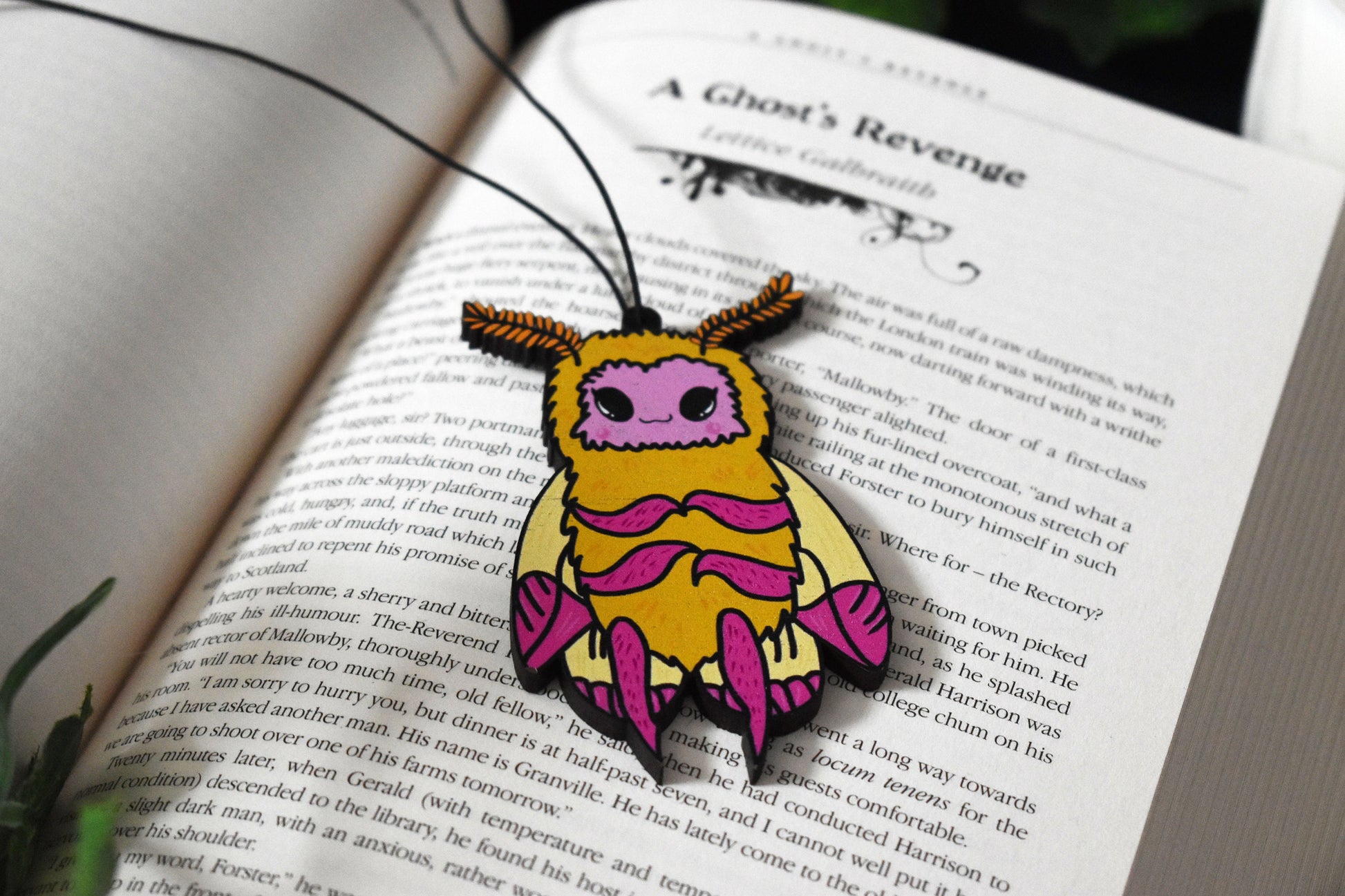 Made from 3mm thick walnut wood, Martha moth is of the rosy maple variety and features a cute pink and yellow colour palette. She hangs from an elasticated cord, measures approx. 3.4 x 2.1 inches and is part of the Haunted Library collection.
